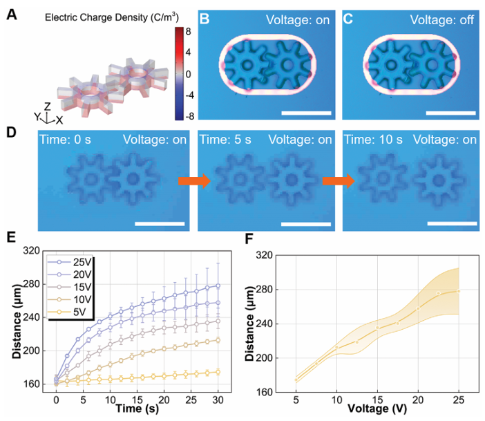 图4. 微齿轮的排斥机制。A) 二维齿轮组表面电荷分布的模拟。B) 光图案促使两齿轮物理啮合的显微镜图像。C) 关闭电压后齿轮运动无明显变化的显微镜图像。D) 关闭光图案后齿轮因电压排斥分离的显微镜图像。E) 不同电压下齿轮间距随时间的变化。F) 不同电压下齿轮最终间距的测量。
