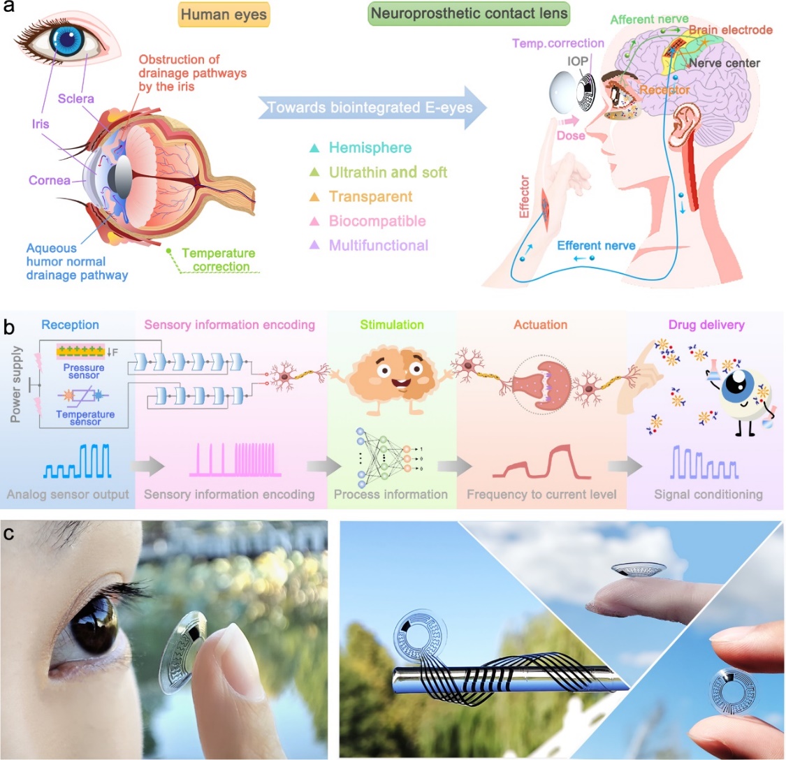 论文通过材料制备、结构设计和器件集成,提出了一种具有高灵敏度、可入眼佩戴的神经形态隐形眼镜,实现了眼压的实时监测和感觉反馈。这一进展为眼部疾病的预防与精准诊疗、治疗提供了新的解决方案。