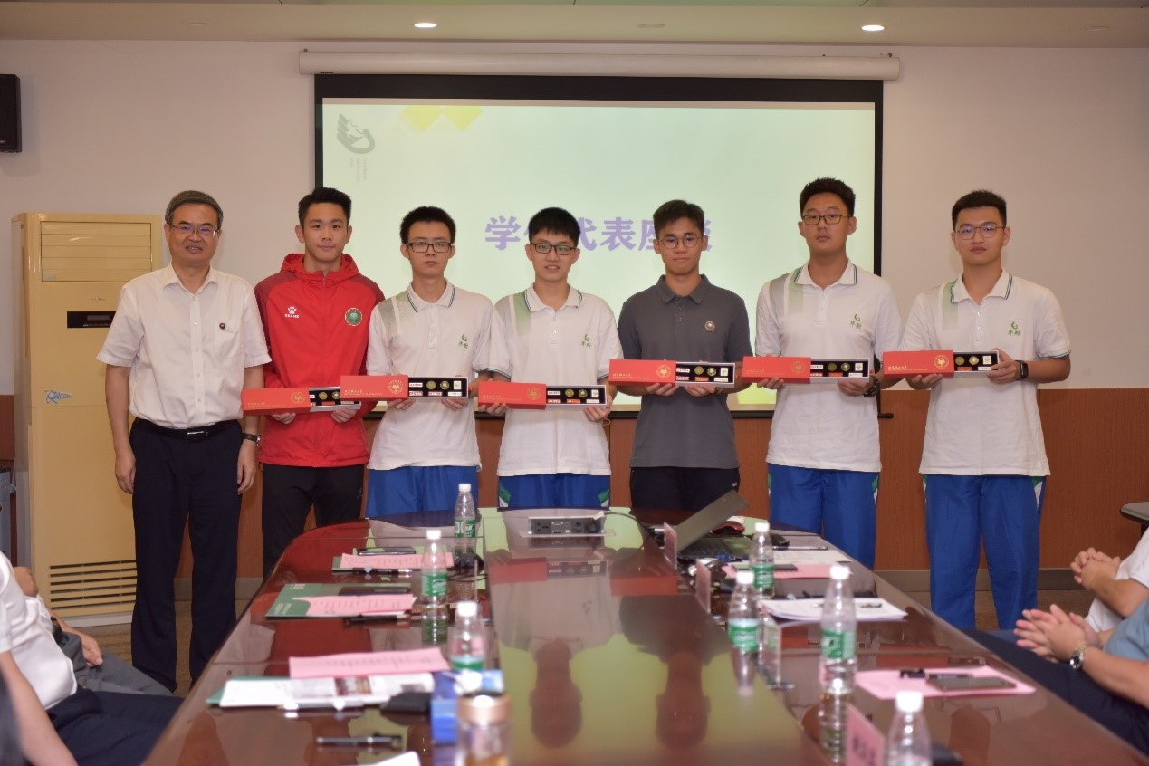 张军为参加座谈的学生代表赠送纪念品并合影。